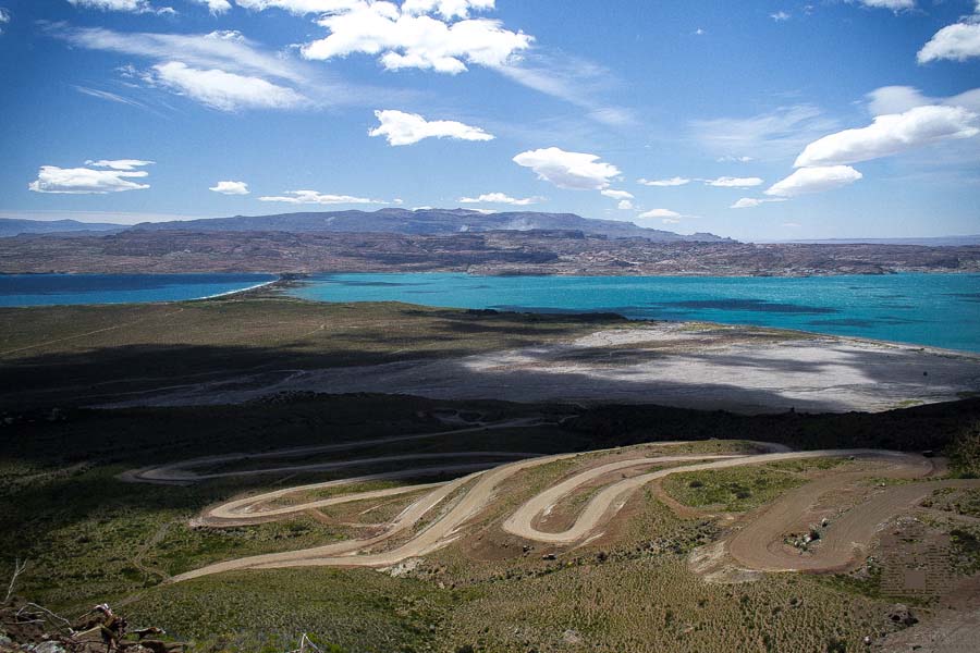 Partiendo del pueblo y transitando la Ruta Pcial. Nº 39, camino de ripio, luego de aprox. 7 km., se comienza a divisar el Lago Posadas, de aguas color turquesa, y un poco más adelante, el Lago Pueyrredón, de aguas profundas y azules. Ambos separados entre sí por una delgado istmo o franja de tierra de 5 km de extensión y 200 mts., de ancho. Distintos miradores naturales ubicados sobre la margen norte de estos espejos lacustres, permiten gozar de excelentes vistas panorámicas, para su admiración y registro, a lo largo de todo el recorrido. En este paseo, un alto en el camino, entre otros, para acceder al enigmático "Arco de Piedra" (una excepcional formación rocosa) ubicado sobre la costa este del Lago Posadas. Todo un icono representativo del lugar.